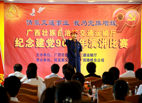 6月10日上午,由集團(tuán)公司承辦的全區(qū)交通運(yùn)輸系統(tǒng)慶祝建黨90周年“情系交通事業(yè),我為黨旗增輝”演講比賽在南寧舉行。自治區(qū)交通運(yùn)輸廳副廳長梁毅、副巡視員黃小幸、廳長助理劉昕等領(lǐng)導(dǎo),廳直屬單位的領(lǐng)導(dǎo)及觀眾共350人到現(xiàn)場觀看比賽。自治區(qū)直屬企事業(yè)工會副主任陳元滾、自治區(qū)直屬機(jī)關(guān)工委組織部部長李祖循等領(lǐng)導(dǎo)應(yīng)邀參加。來自廳直屬單位共23位選手參加了此次比賽。