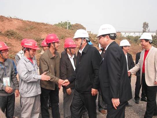 當(dāng)天,楊道喜副主席來到玉鐵5標(biāo)K56+365.291沙田互通建設(shè)現(xiàn)場,當(dāng)看到著裝整齊、精神抖擻的廣西路橋員工隊伍,感受到大干旱季、沖刺收尾階段的熱烈氣氛時,楊副主席上前與項目員工一一握手并親切問候到:“廣西路橋的員工,你們辛苦了”。他鼓勵廣西路橋建設(shè)者要做好廣西交通基礎(chǔ)設(shè)施建設(shè)的排頭兵,在確保質(zhì)量、安全的前提下,克難攻堅,全力推進(jìn)工程建設(shè)進(jìn)度,堅持年底完成全線主體工程的目標(biāo)不動搖,為玉鐵高速公路的建設(shè)做出積極貢獻(xiàn),為推動廣西經(jīng)濟(jì)社會又好又快發(fā)展做出新的更大貢獻(xiàn)。