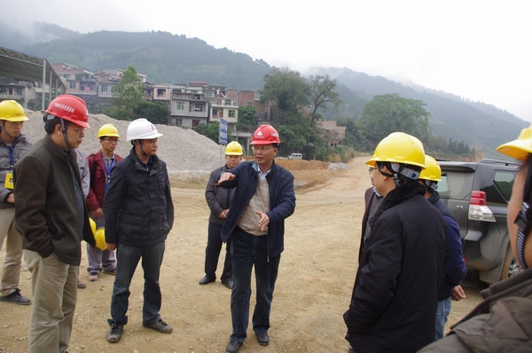 圖為集團(tuán)公司總經(jīng)理李定倫(圖中)、總工程師覃炳賢(右二)在那平路項目施工現(xiàn)場指導(dǎo)工作