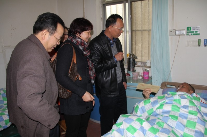 集團公司總經(jīng)理李定倫(左三)和總工程師覃炳賢(左一)慰問生病住院的老黨員何家福同志