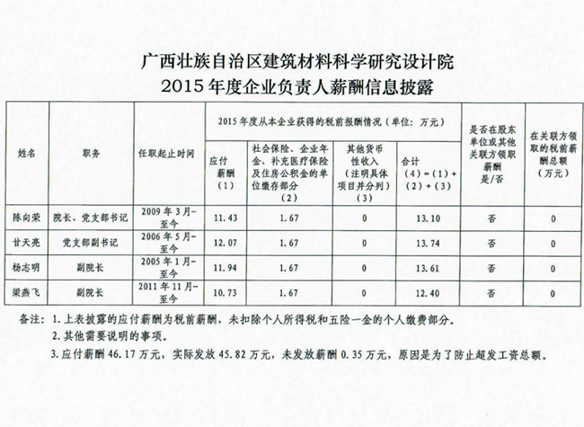 廣西壯族自治區(qū)建筑材料科學(xué)研究設(shè)計院2015年度企業(yè)負責(zé)人薪酬信息披露