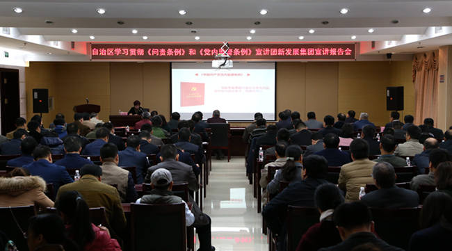 2017年2月24日上午,自治區(qū)學(xué)習(xí)貫徹《中國共產(chǎn)黨問責(zé)條例》《中國共產(chǎn)黨黨內(nèi)監(jiān)督條例》宣講團到集團公司舉行宣講報告會,自治區(qū)紀(jì)委宣傳部部長陳柳青作宣講報告,集團公司黨委副書記、副董事長、總經(jīng)理唐咸秋主持會議。