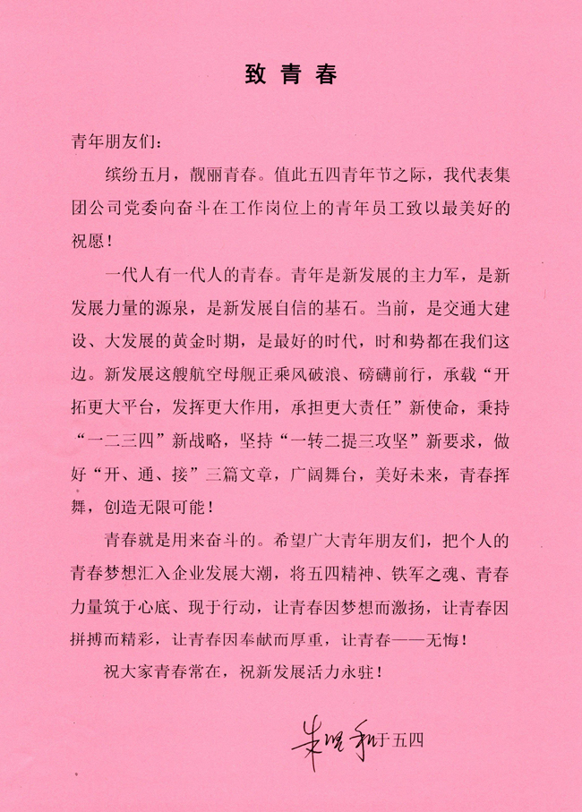 朱堅和書記傳達了習近平總書記在中國政法大學的重要講話精神,并宣讀了致青年朋友們的一封信——《致青春》,向奮斗在工作崗位上的廣大青年員工傳達了殷切期望與美好祝愿。信件原文如下: