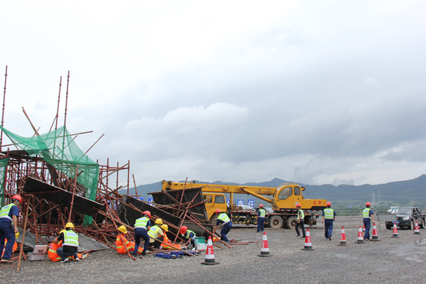 支架坍塌事故假想地點位于賀州至巴馬高速公路(鐘山至昭平段)新竹立交橋,假設工人在施工作業(yè)時,新竹立交橋支架突然坍塌,導致四名作業(yè)人員被困,其中一名被壓在鋼管下已昏迷,另一個工人手臂大量出血,其余兩個輕傷。