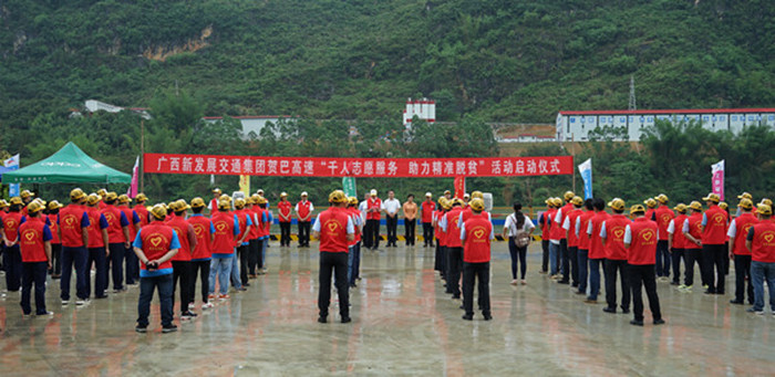 新恒通公司黨委書記、董事長賴水平介紹,集團公司所建設(shè)的賀州至巴馬、融水至河池高速公路是廣西縣縣通高速公路重點工程,沿線大部分縣區(qū)仍屬貧窮縣。為響應(yīng)中央精準扶貧和建設(shè)美麗中國的號召,擔負起國企的社會責任,新恒通公司組織全線參建單位成立青年志愿者服務(wù)隊,結(jié)合項目實際,從2018年1月至2020年12月在賀巴、融河等高速公路全線范圍內(nèi)開展為期三年的“千人志愿服務(wù),助力精準脫貧”活動。