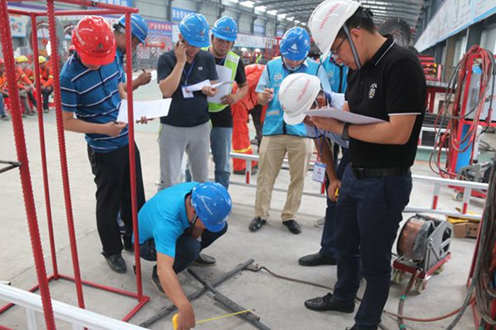 本次比賽采用Ф28鋼筋作為焊接母材,共分為單面平焊、立焊、仰焊三個(gè)比賽項(xiàng)目,每位參賽選手需在規(guī)定時(shí)間內(nèi)按照比賽要求焊接一組試件。評委按照鋼筋焊縫長度、焊縫深度、焊縫寬度、焊接時(shí)間、是否有咬邊、焊接平整度、焊接成型等幾個(gè)方面進(jìn)行評分。