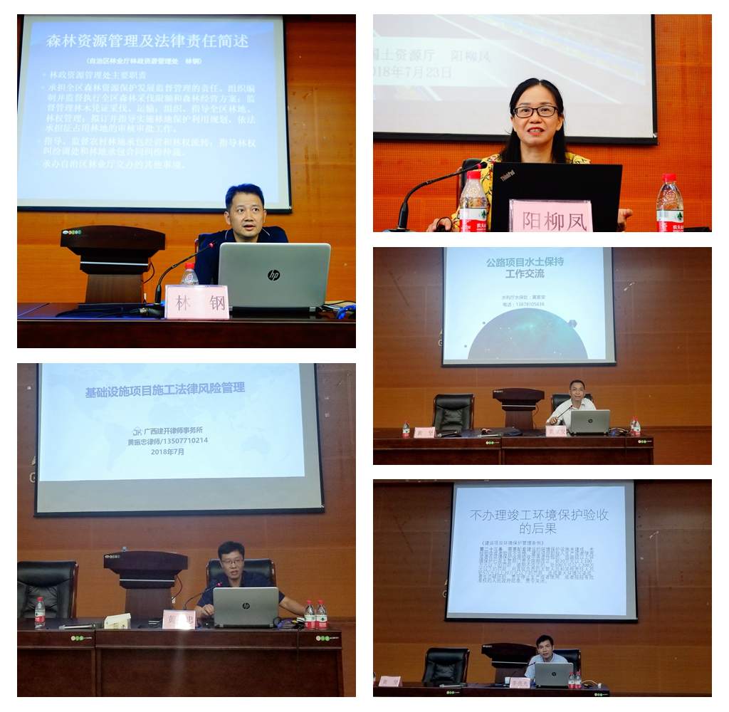 此次培訓邀請了自治區(qū)國土資源廳規(guī)劃處副處長陽柳鳳、林業(yè)廳林政處副處長林鋼、環(huán)境保護廳環(huán)評處處長李亮光、水利廳水土保持處副處長黃家安以及廣西建開律師事務所主任黃振忠律師5位專家圍繞項目建設過程中的國土、林地、環(huán)境保護、水土保持以及項目經(jīng)營常見法律政策問題進行專題授課。此次培訓緊貼建設項目管理的實際需求,內(nèi)容豐富,針對性強。通過培訓,提高了廣大建設項目管理人員的法律政策水平,增強了處理具體法律問題的能力,對今后依法依規(guī)建設項目起到很好的促進作用。