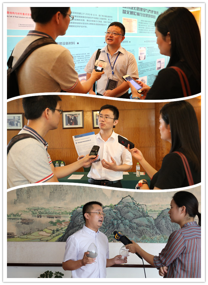 圖為廣西交科院熊劍平博士(上)、張洪剛博士(中)、周勝波博士(下)接受媒體采訪介紹會議情況和公司最新產(chǎn)品研發(fā)成果