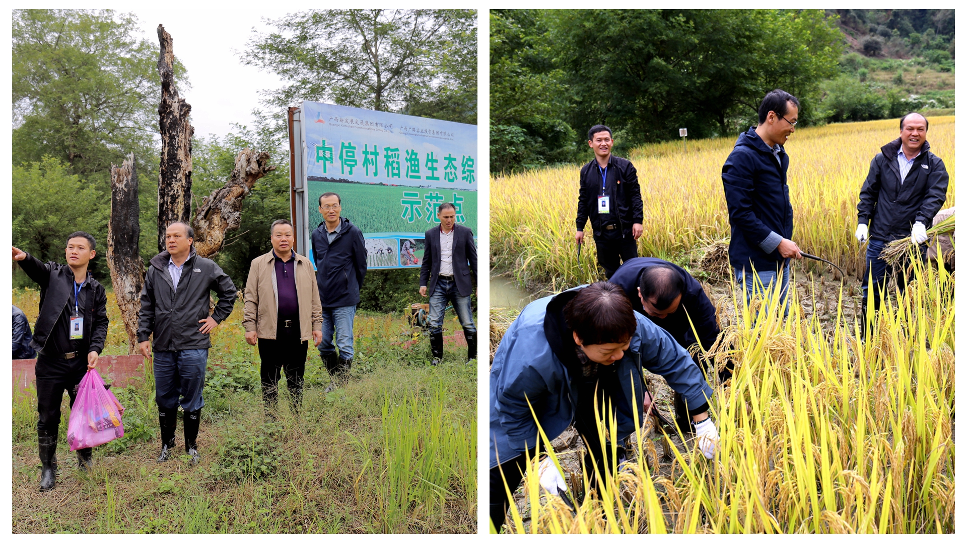 實(shí)地察看集團(tuán)公司援助建設(shè)的中停村有機(jī)米產(chǎn)業(yè)(核心)示范區(qū),同村民一起收割稻谷。