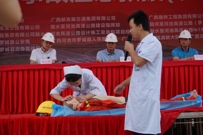 當(dāng)天的演練現(xiàn)場模擬情景為:2019年6月20日,在羅城縣四把鎮(zhèn)沖灣屯附近,融河高速公路K54+100高邊坡處現(xiàn)場4名邊坡防護(hù)作業(yè)人員正在緊張的施工,由于連續(xù)雨天上邊坡坡頂土體部分突然滑落,繼而出現(xiàn)大的滑坡裂縫,隨之大面積土石體坍塌,1名施工人員被垮塌的土石壓埋。事故發(fā)生后,參與演練人員及時報(bào)告和啟動應(yīng)急預(yù)案,在坍塌現(xiàn)場設(shè)置臨時指揮部,指揮現(xiàn)場救援,將傷者抬出被困位置后,在演練會場進(jìn)行現(xiàn)場醫(yī)療和急救演示,再由救護(hù)車送到羅城縣人民醫(yī)院進(jìn)一步治療。